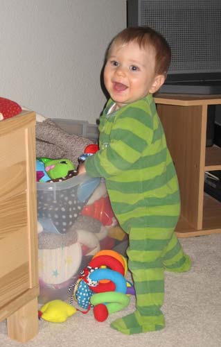 Henry's figured out how to pull himself up and access the toy bin. Gone are the days when we could maintain some semblance of control over the chaos in the family room by choosing which toys Henry could play with.