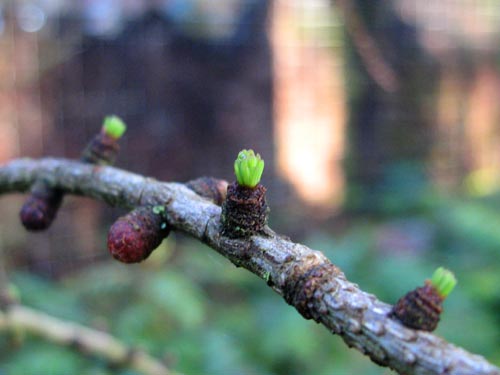 Henry's larch is just beginning to bud after a long (and maybe not quite over yet) winter. We planted it last October just as it was losing its needles for the winter so there was a little worry that it wouldn't make it back, but hurrah!