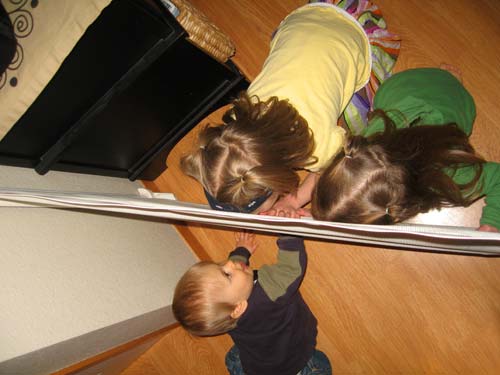Clara and Lilly visit with Henry through the gate in the hall. Since Henry's been on the move more we've had to sequester the big kid toys from the little kid and unfortunately that means the big kids from the little kid, too. Still... they make it work. (Usually by knocking the gate down or sliding under it.)