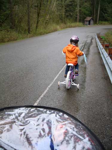 Two important things to note: (1) Clara's training wheels are at their highest position and both off the ground. (2) It was snowing. (3) It's the middle of April.