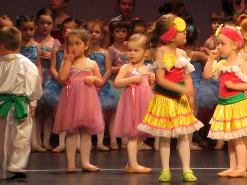 Thank goodness it was just the dress rehearsal. Lilly tries to figure out where she's supposed to be during the finale of her ballet recital. Clara was in it, too, but she's experienced at the whole ballet thing and has it down pat.