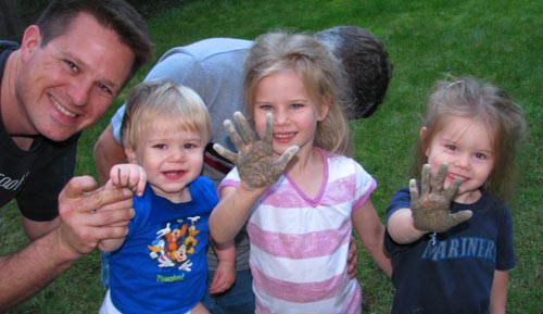 The kids show off their cement-covered hands after leaving their mark in a new fencepost footing. Papa was trying to be inconspicuous. FAIL.