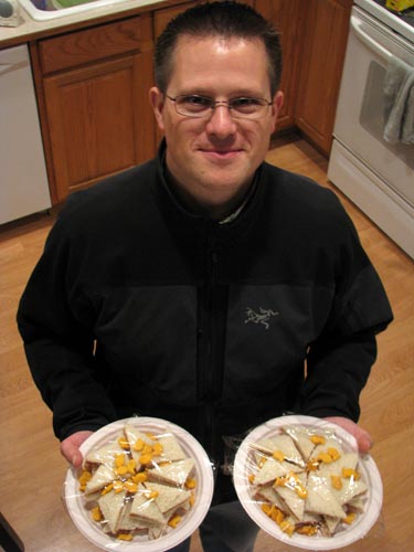 For the end-of-season TNAB party I decided that rather than bring something that people would like I'd bring something funny: pbj finger sandwiches with a goldfish garnish. Just like what I eat on TNAB hikes, but somehow less appropriate in a social setting.