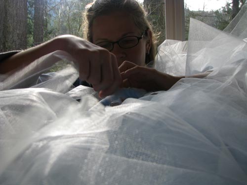 Amy is engulfed in Sisters-blue tulle as she works on new White Christmas costumes for the girls. Each skirt takes almost 20 yards of the stuff, but is so light the girls can float around the stage without effort.