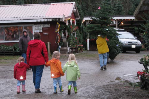 Nana guides the girls to the tree bundling station at a farm in North Bend. Auntie Nicole and Uncle Boppi scoffed because the Fords and Chevy's they were used to in the South... um... "Midwest" were replaced by Lexus and Land Rovers. I guess there's nothing wrong with living in the city if it looks like North Bend...