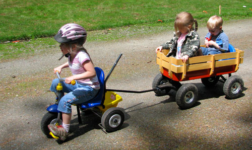 Clara was a big help distracting Lilly and Henry while we worked around the house. She took the top of the handle off Henry's trike, hooked up the wagon, and went round and round and round again. There was only one roll over accident and a couple of jackknives so it was a pretty decent success.