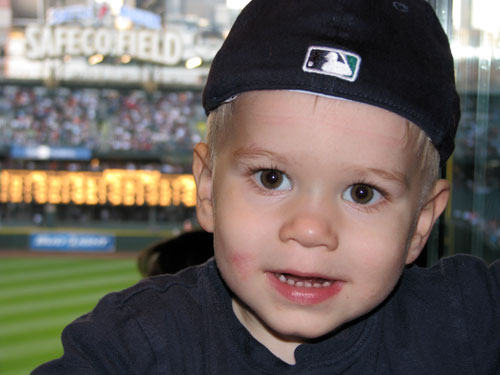 Henry's too much of a handful to get to go to many games this year, but it's a lot easier when he can run around in Godfather Gregg's suite. We lasted through the ninth inning when Griffey went down with the bases loaded in a sea of popping flashbulbs, but when the 10th inning began we headed for home. (Amy and I heard the final out sitting in our driveway with the three kids sleeping in the back.)
