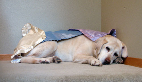 The kids decided Tokul needed some comfort while she snoozed on the landing. Tokul didn't seem to mind.