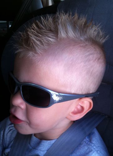 My father always said my hair in college was my grandfather's revenge for the hair my father sported in high school. I guess this is what I deserve. I kind of thought it'd be a little later than preschool, though. (Yes, Amy did this to the poor boy. And he loves it.)