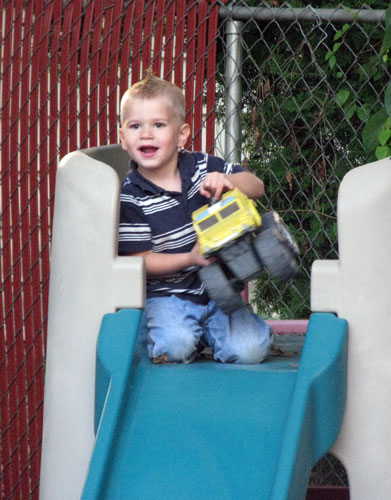 Henry had a blast at Meet Your Teacher night. The trucks that made repeat trips down the slide and into the wall and into each other... maybe not so much.