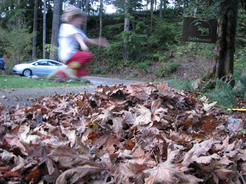 Clara's just a blur as she jumps into Fall's bounty in our driveway. All three kids were crazy for the leaves until it was time to cart them to their final resting place. Apparently, that's Daddy's job.