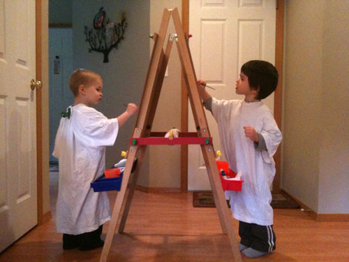 More like Jackson Pollock and Cy Twombly. Henry and Ethan painted mostly on the paper, but also on their shirts and each other. Good times if not good art.