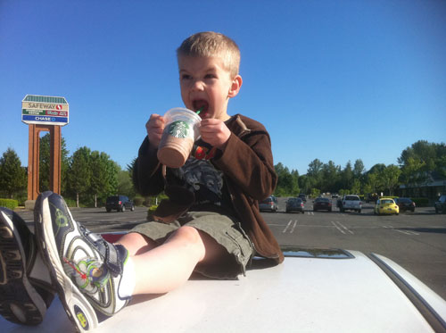 You know. Because donuts for breakfast isn't going to jack him up enough. (Oh, relax. There was no coffee in it. Like I'm going to give him caffeine before he's 12.)