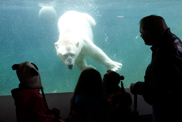 Polar bears are one of the only animals that will hunt a human. Especially a little human. And even though the kids can sometimes to not be human, I bet the bear wouldn't mind. Besides, it's best to eat them while they're still young and tender. Thankfully, the "glass" at the Point Defiance Zooarium was plenty strong and we escaped with our lives and our hats.