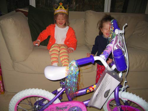 Clara and Lilly keep their eyes tightly shut as we set up Clara's princess bike. Both Clara and Lilly got to ride it around the house before we headed out for the night. In three laps there has only been one minor accident, but we're attributing that to user error.