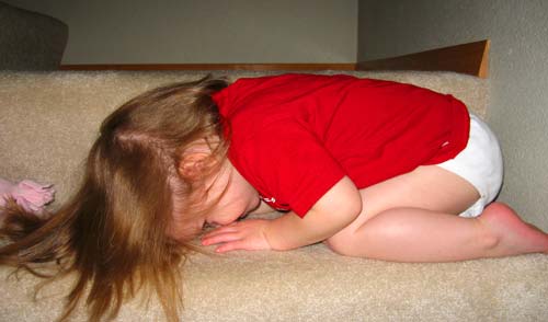 Lilly plays the ever-popular "Where my _______?" game on the stairs. Both Clara and Lilly are excellent at this game, which involves one of them "hiding" and saying, "Daddy! Say, 'Where'd my _______ go?'" (Insert the requestor's name.) After a few moments of "looking" they uncover their eyes and I say, "Peek!" Hours of fun.