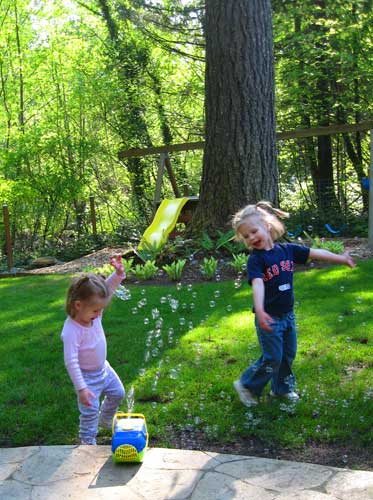Spring finally arrived, if only for a day or two, and we couldn't deny the bubble machine to the girls. All was good until Lilly tried to move it and dumped the entire reservoir on the patio. Luckily it rained the next day so at least one portion of the patio was sparkly clean.