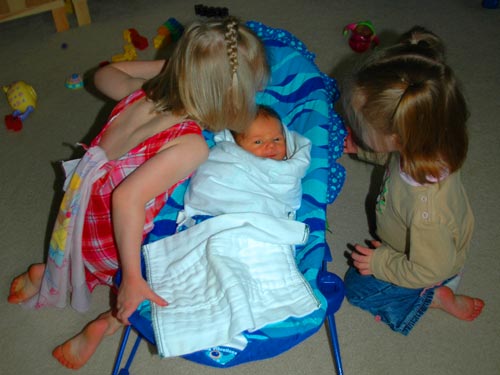 Henry is overwhelmed with love from his big sisters after being released from the box. His billi score is down to a 12 so he's been taken off of phototherapy! Hurray for home healthcare.