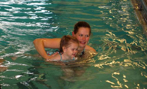 Amy helps Lilly swim to the side of the pool during Lilly's first swim lesson. Clara was in the session in the previous hour and both classes were at the local community pool.