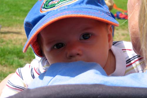 Henry peeks over Michelle's shoulder at Clara's soccer camp. At nine weeks he is almost 12 pounds and in the 50th-75th percentile for all his measurements. (The girls were both down around the 25th percentile by nine weeks.)