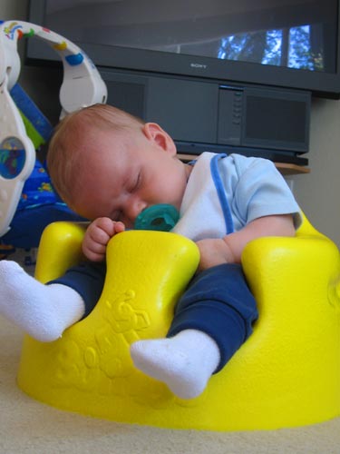 Little kids sleep a lot. Thank goodness for Bumbos. Henry's grown quite happy with his foam rubber chair. Unfortunately, the girls are still tiny enough they can squeeze into them, but then wind up wandering around with the seats stuck to their... seats.