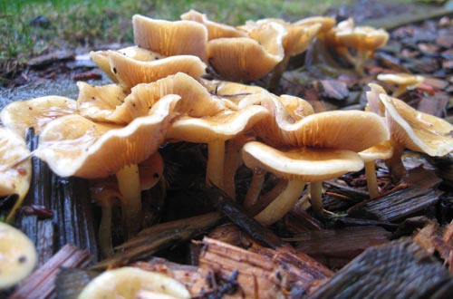 Freaky mushrooms magically appeared in the play area in the backyard. In a probably vain attempt to get rid of the infestation we hauled out three wheelbarrows full of shroom and bark.