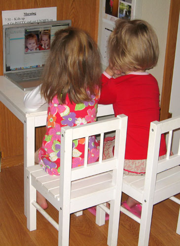 Clara and Lilly wait with an amazing amount of patience for a video conference to begin. Video conferencing has been a great way to stay in touch with folks far away and sometimes even with me at work.