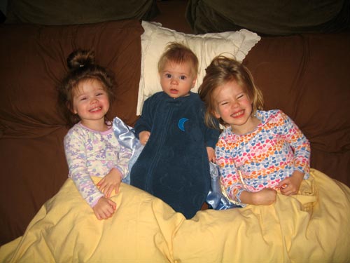 Lilly and Clara enjoy a somewhat bewildered Henry early Saturday morning. Amy had already left for the day and in the space of just a few minutes all three kids had woken. I woke shortly afterward.