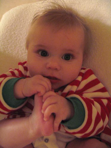 In the fine tradition of our crazy kids, Henry was caught sucking on his own toes. I guess if that's the only thing we catch him doing we'll be in luck.