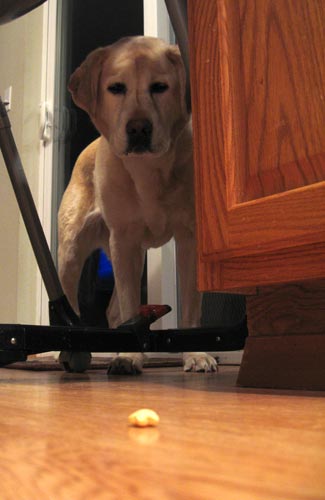 Tokul waits for her chance to pounce on a wayward sweet potato puff that fell from the heaven that is Henry's high chair. One of Tokul's happiest days was when we introduced Henry to Cheerios and other finger foods.