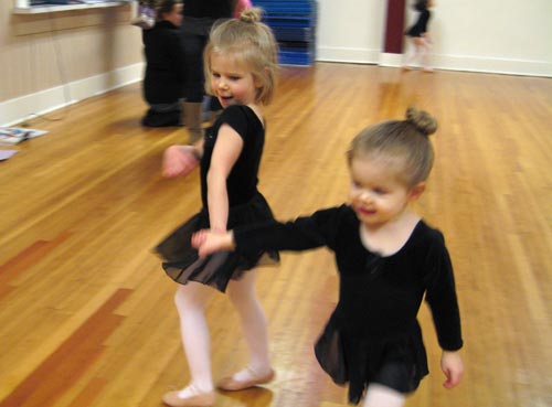 Clara shows Lilly some fancy ballet steps at the first day of class. Unfortunately, Lilly's first day of ballet was supposed to be Monday, but the snow had a different plan. So instead Lilly wore her gear to Clara's first day and still had a blast.