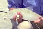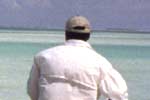 The next day we started at Orvis Flat, but the water was too deep. We headed to a brilliant white-sand flat called Motopua. We blind cast into the deep and picked up a bunch of bones and a couple "other" fish including a goat fish complete with "whiskers." The guide said they were especially tasty so he slipped it in his pocket for dinner. Speaking of dinner it was luau night. On Kiritimati that means you get to look a dead pig in the eyes after its been roasted for hours while a big guy with a knife stands over it hacking off bits for you. How sophisticated and tasty. With high winds the next day started out difficult. We boated to Smokey Flat where there were schools of bones coursing across the sands. We fished in one spot for almost an hour before moving down the flat. At the end we boated across a channel to Perry's Wharf where my dear father hooked and landed a monster of a bonefish. We shot loads of pictures, but it looks like there must have been water on the lens making most of them less than perfect. Dang. We ended the day by fishing Paris Flat which is great during full moons, but not so good during the day. (Amazingly, our guide walked through the very sharp coral in his bare feet. Ouch.)