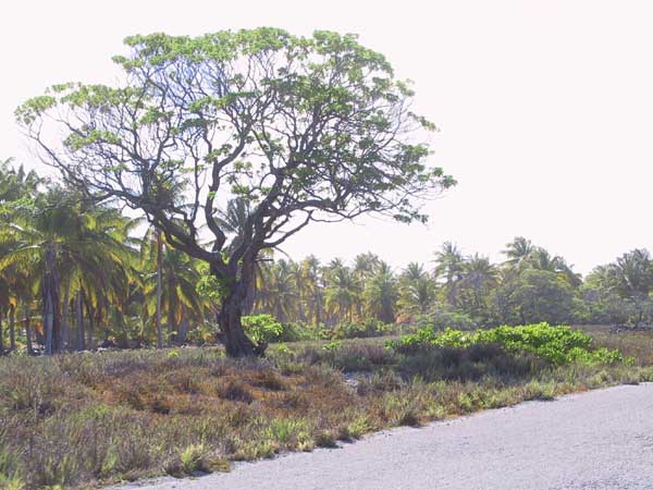 On Kiritimati there are basically three plants. Grass, palm trees, and this guy which starts as a ground-cover (in the bottom right near the road) and as a tree.