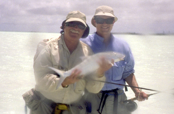 Bloody water drops! John and his father pose on Perry's Wharf flat with the biggest bonefish caught on the trip.