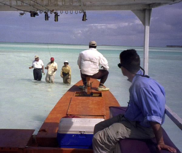 Onboard the skiff John and his guide await Tony, Mary, and their guide to board after fishing a flat.