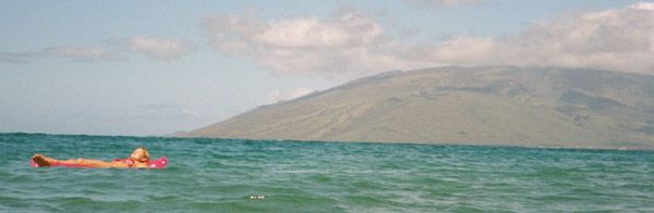 Amy floats the day away on the waves outside our hotel. The island in the background is... something. I don't remember. Besides, you think I'm really looking at the mountain?