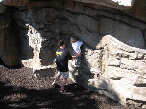 I spot Clara as she makes her way along the climbing wall in the outdoors section of California Adventure. < previous | next >