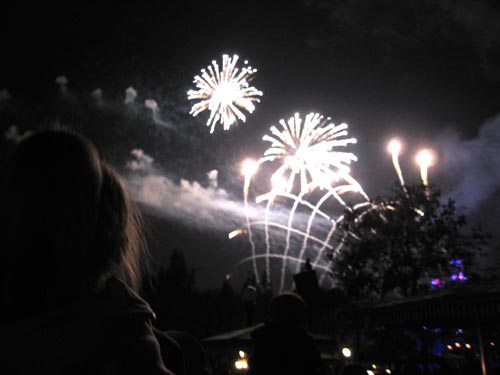Lilly is silhouetted by the glow of a massive fireworks show in Disneyland on our last day in the park. < previous | next >
