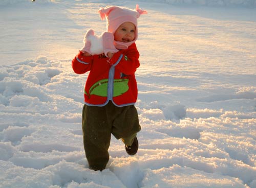 Clara chases after Uncle Ryan with a monster snowball near sunset.