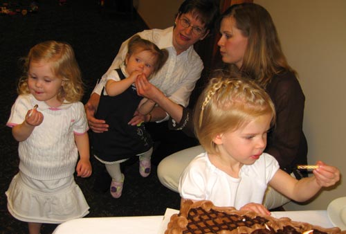 Sierra, Lilly, and Clara lick frosting off Gramps' birthday candles.