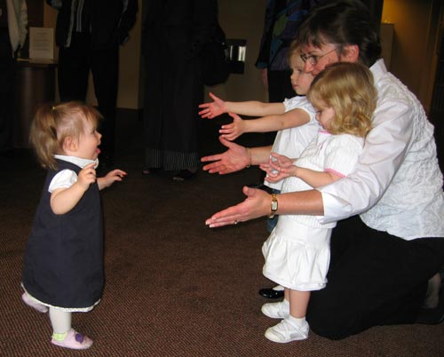 Nana, Clara, and Sierra hold out their hands to Lilly who chose the day of Gramps' birthday party to start walking in earnest. < previous | next >