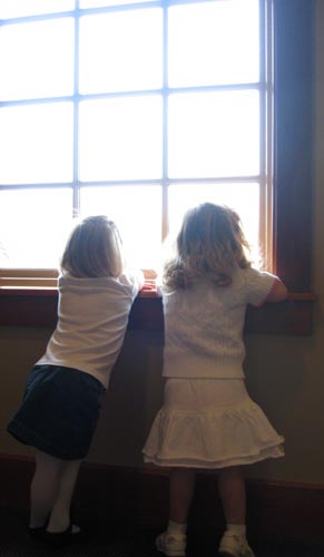 Clara and Sierra look out the window toward the end of Gramps' birthday party. In spite of the bright light it was pouring rain. < previous | next >