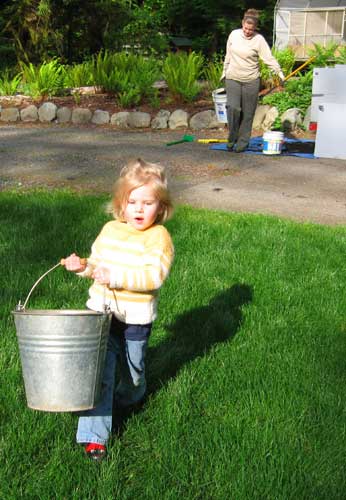 Clara acts as an integral part of the front-yard-improvement machine as she carries a bucket of bark to the bed against the neighbors' fence. Amy redesigned several of the front beds almost single-handed. (I was... uh... taking care of Lilly. Yeah. That's it.)