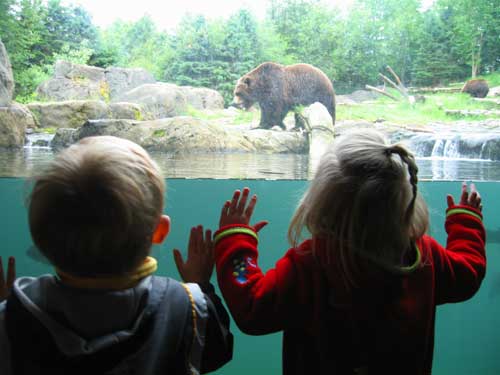 Clara and Lex peek over the surface of the water (filled with trout, by the way) at the grizzly pacing about. < previous | next >