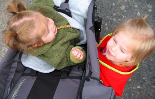 Clara, sitting in the lower, back seat of the stroller, entertains Lilly by popping out the side and yelling. (Yes. This happened only while the stroller was moving and in heavy traffic.)