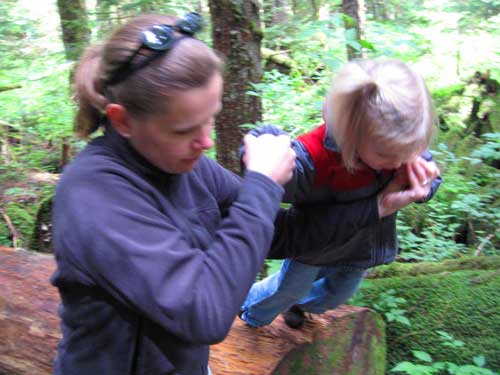 Amy assists Clara in a leap from a log along the Barclay Creek trail.