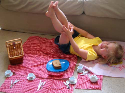 Lilly was asleep so it was safe to break out the more grown up version of Clara's Vegas tea pot and cups. She had a delightful lunch-time picnic on the floor of the living room with room for three of her best friends.