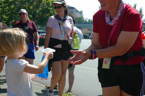 Clara sprays walkers as the temperature rises.