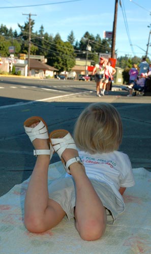 Clara waits for walkers on the curb in Lake City Way.