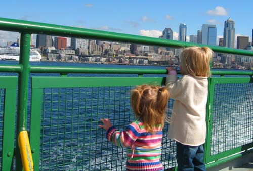 Lilly and Clara look over the rail at the Seattle waterfront on the way to Bainbridge Island. < previous | next >
